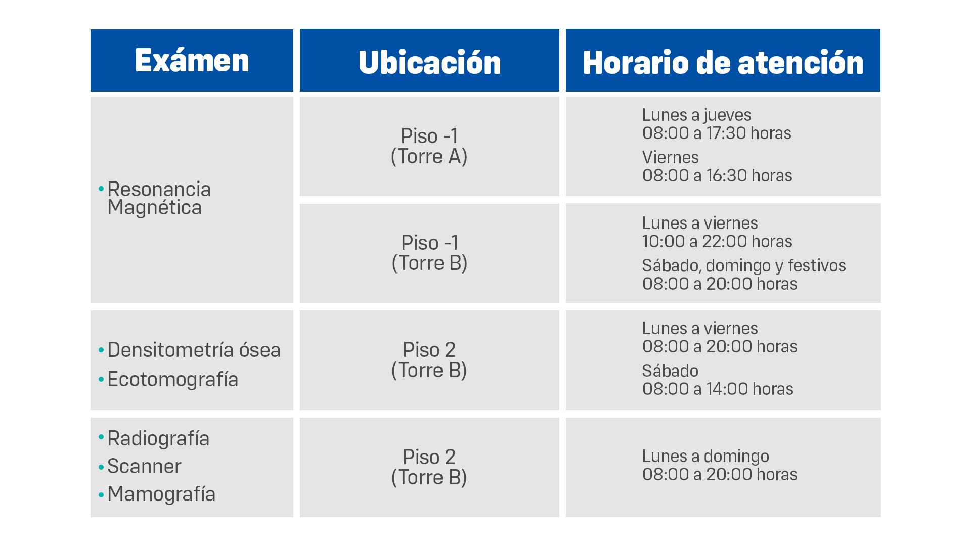 • Traer orden médica impresa y exámenes anteriores si los tuviese.